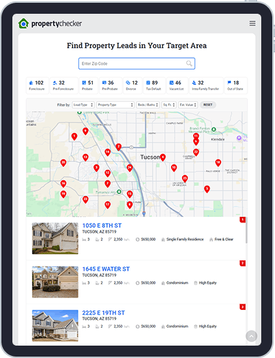 Unlock high-potential real estate opportunities with our powerful Property Leads platform. Search for distressed properties, pre-foreclosures, tax liens, vacant homes, inherited properties, motivated seller listings, and probate properties, all in one place. Whether you're flipping, building, wholesaling, or buying rental investments, our data-driven tools help you identify off-market deals before the competition. Filter by equity position, ownership length, absentee status, and more to find properties with true upside potential and maximize your ROI.